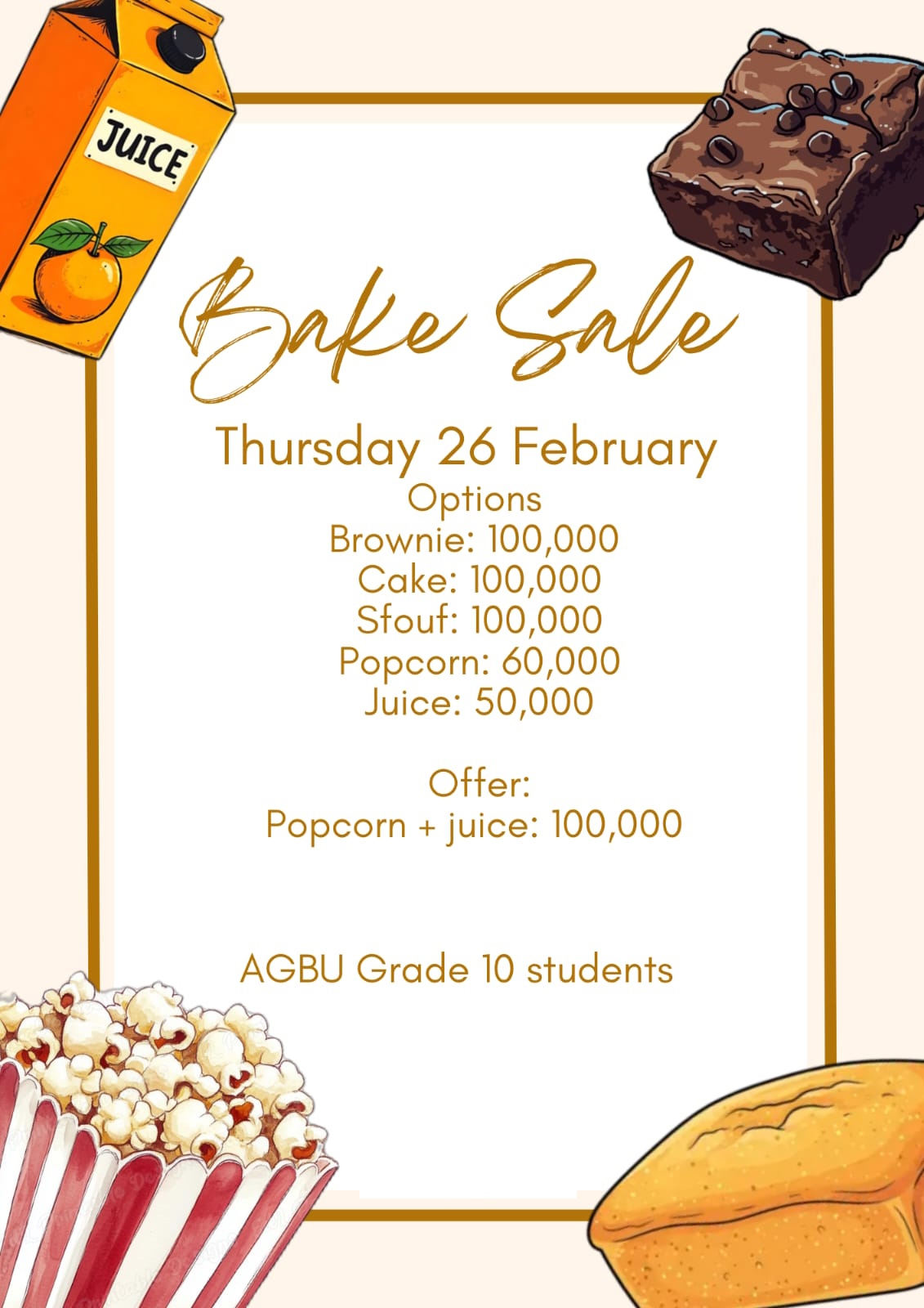 We are excited to announce that the Grade 10 learners of the AGBU Schools will organize a bake sale on Thursday, the 26th of February 2026.